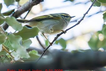 Mosquitero de Pallas. Mosquito reietó. Phylloscopus proregulus. Pallas's Leaf WarblerCaptado en el Sot del Migdia, Montjuïc. Barcelona. Foto de Miguel Jodas, 9 de enero de 2025.
