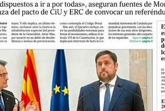 A saber si la portada guerracivilista del diario bórico la han redactado en la calle Génova, como hicieron durante la campaña de las últimas elecciones catalanas para que PedroJota dijese lo que Mariano no se atrevía esgrimiendo un informe policial falso en mano, o la media naranja de Exhuperancia le ha tomado la alternativa al gobierno publicando lo que se supone que este debe hacer, cosa que por lo visto le debe gustar bastante.