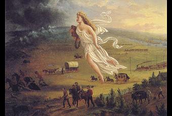 American progress (1872) de John GastSi bien el romanticismo liberal de Whitman (1819-1892) difiere en gran medida del romanticismo reaccionario de Schlegel (1772-1829) y compañía, es posible encontrar algunas similitudes ideológicas importantes, entre ellas su relación con el milenarismo de tipo nacionalista y colectivista (recuérdese aquel gráfico), que en el caso norteamericano responde al nombre de Manifest Destiny. Siguiendo a Herder, el poeta neoyorquino llegará a afirmar en 1888 que "la poesía realmente grande es siempre (...) el resultado del espíritu nacional, y no el privilegio de una minoría refinada y selecta". Bien por lo segundo. No así por lo primero.