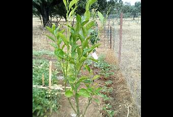 Creo que ya os he hablado de los frutales que habíamos colocado en el huerto, lo que es el limonero y el naranjo grande de mas de dos años había perdido la mitad de las hojas y la verdad es que no se veía con mucho espíritu para que salga adelante. Sin embargo desde hace unos días y tras aplicar un rocío de antifunjico ha comenzado a salir adelante, creo que también el tiempo fresco y lluvioso ha activado algo para que comience a echar hojas nuevas. Solo estos dos frutales son los que se han parado, ya que tanto el pequeño que colocamos como los dos que estaban secos y brotaron se ven con crecimiento mientras que el resto sigue parado.