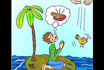 Había una vez un hombre que había naufragado en una isla en medio del mar. Hacía mucho calor y como tenía sed se puso de rodillas y juntando sus manos comenzó a orar:_Señor, estoy en una isla en medio del mar. Tengo mucha sed. Dame un coco de agua, por favor, Señor, un coco de agua_ Dios le dio el coco de agua._ Señor tengo frío, dame fuego. Por favor, Señor, dame fuego_ Dios le suplió el fuego.