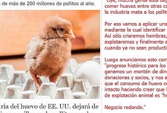 "La industria del huevo de EE. UU. dejará de triturar vivos a millones de pollitos macho".Con esto quiere referirse al hecho de que la organización norteamericana Humane League afirma haber convencido a la industria avícola para que aplique una técnica que permite identificar y desechar los huevos que contengan embriones masculinos, con el fin de incubar sólo los que contengan embriones femeninos para que se desarrollen como gallinas y poder quitarles los huevos que produzcan para venderlos. Los pollitos macho no pueden poner huevos así que son asesinados al poco de nacer.