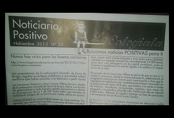 Me acerqué a una panadería sin puertas, de ésas que tienen el mostrador en la misma calle. Eché un vistazo a los dulces pero la mirada se me desvió en seguida hacia un folleto en blanco y negro cuyo título chocaba a una vista demasiado acostumbrada a malas noticias. El Noticiario Positivo parece ser una publicación habitual en la región de Murcia y su éxito radica precisamente en la positividad de todas y cada una de las palabras impresas en sus escasas 4 páginas. Frases como “Quien mueve montañas empezó apartando piedrecitas” o “Despierta cada mañana con el pensamiento de que algo increíble está por suceder”… son algunas de sus perlas. Experiencias personales enviadas por los propios lectores o los briconsejos de otro de sus colaboradores son parte de su contenido.Buscando la positividad hasta en las situaciones más rutinarias y comunes… siempre podemos encontrar la parte “menos mala” de cualquier circunstancia. Es mi tarea pendiente, lo reconozco, y es por ello que, entonando el mea culpa, hago eco de esta publicación tan especial. Enhorabuena por una iniciativa tan emotiva.
