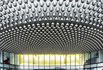 Este motivo consiste en una pieza de curvatura esférica hecha de acero inoxidable muy pulido, que se fija sobre un fondo construido con planchas de aluminio mate para generar, simplemente por los acabados de los materiales, una sensación de contraste luminoso. Los 42.333 casquetes esféricos que revisten la envolvente son fruto de una rigurosa seriación, que parte de una semiesfera de 60 centímetros de diámetro cortada a diferentes alturas para dar pie a 9 módulos distintos.