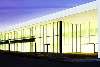 Concebido como un gran pórtico, el frente norte presenta superficies acristaladas retranqueadas con respecto a la línea de fachada, y un porche que da acceso al vestíbulo de doble altura. La construcción está envuelta con paneles de hormigón blanco en cuyo acabado está texturizado con letras de diferentes alfabetos, en bajo relieve. Celosías con láminas de vivos colores protegen los interiores de la radicación solar.