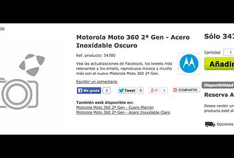 La primera opción es el Moto 360 2ª Generación con correa marrón (la que vemos referida internacionalmente como cognac-leather), ó la correa en acero inoxidable claro, en ambos casos el precio es de 347,99€. Parece que esta opción correspondería al Moto 360 S, el más pequeño de 32 milímetros.