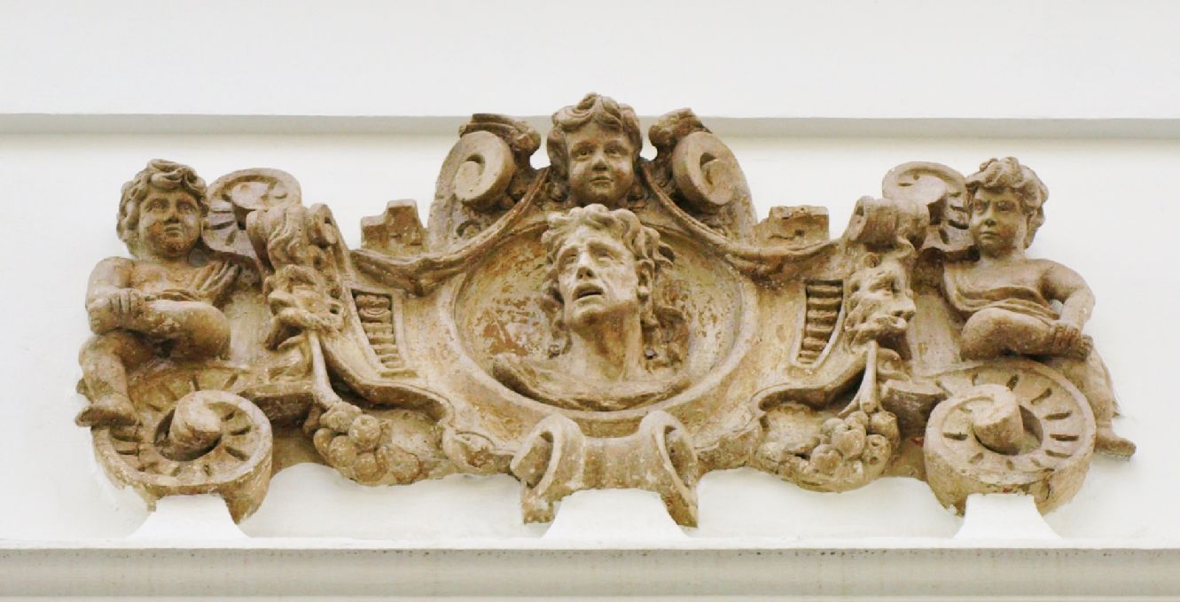 El conjunto arquitectónico está completado con unos relieves. Los del balcón central confunden elementos humanos con elementos mitológicos (dragones, grandes serpientes, águilas, leones...). Los de los balcones laterales son un poco más dulces a la vista, con querubines alrededor de una cabeza humana.