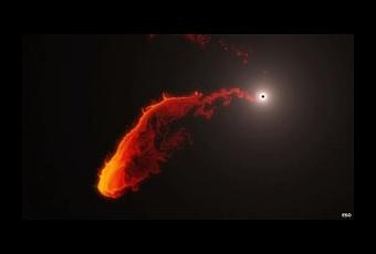 Esta imagen muestra una instantánea de una simulación del posible comportamiento de una nube de gas que se está acercando al agujero negro del centro de la Vía Láctea.