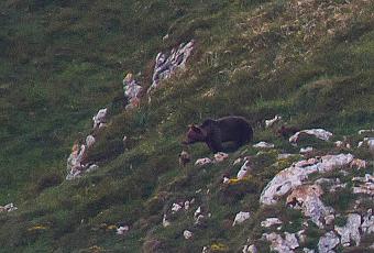 Osa con dos crías en unas montañas del centro de AsturiesLa población de osos (Ursus arctos) de la Cordillera Cantábrica es una de las más amenazadas del mundo ya que no llega a los 200 ejemplares y se encuentra en un hábitat muy humanizado, donde la superficie forestal apenas llega al 30%, que es la menor de todas las poblaciones europeas (Fernández Gil, 2013). Tan sólo hace unos pocos años, la población de osos no llegaba a los 80 ejemplares, con un número de tan sólo seis osas con crías en el año 1986.