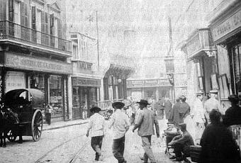 Esta vez estamos en otro punto diferente de la calle, totalmente inusual en los gustos del fotógrafo para ser elegido como enclave para la cámara y que nos muestra una vista totalmente diferente de La Campana antes del ensanche. Imaginemos que a la izquierda tenemos la Confitería La Campana, tras de nosotros el Café Novedades y al fondo La Farmacia Central...