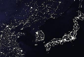 Corea del Norte desaparece bajo la noche. Su pobreza y atraso se hacen escandalosos vistos desde el espacio. Toda retórica o propaganda política palidecen ante esta imagen.Sería difícil en el mundo encontrar un contraste tan brutal entre dos países que paradójicamente comparten tantas cosas.