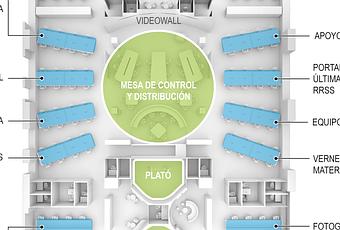 - La Mesa Central de Control y Distribución responde al propósito de colocar al usuario en el centro de toda nuestra tarea. Así, el elemento que mayor presencia tiene en la zona más caliente de la redacción es un panel de control o videowall en el que los periodistas, desarrolladores, diseñadores, fotógrafos, infografistas, editores de vídeo, responsables de redes sociales, de SEO y analítica observan en tiempo real qué están haciendo los usuarios y cómo se comporta el producto en todas las pantallas en las que se distribuye la información.