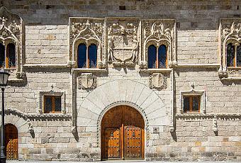 Enmarcando este arco de la puerta principal, nos encontramos un alfiz, con escudos lisos en sus enjutas y justo encima de estos otro con las armas de los Sanabria, Velasco, Herrera y Enríquez (aparecen en la imagen de esta publicación en la esquina inferior izquierda), sujeto por dos MOMOS y coronado todo ello por un yelmo, una maza, dos niños luchando y varios dragones. A sendos lados de este elemento central, se abren dos ventanas simétricas geminadas y con un bello parteluz, rematadas por motivos vegetales y figuras zoomórficas. En este mismo cuerpo, se abren otros tres vanos similares en diseño, aunque más pequeños que los anteriores.