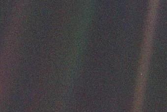 Imagen 1: Captura de la Tierra desde la Voyager 1. El pequeño punto azul pálido situado hacia el centro ligeramente desplazado hacia abajo en el rayo más a la derecha, es nuestro pequeño planeta. Créditos: NASA-JPL.