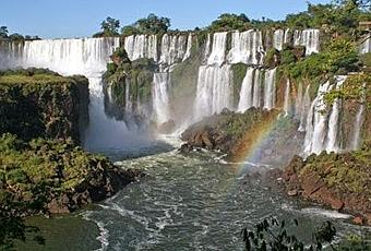 Las cataratas del Iguazú están formadas por 275 saltos de hasta 80 m de altura de los cuales el 80% están del lado argentino, alimentados por el caudal del río Iguazú. Se pueden realizar paseos en lancha bajo los saltos y caminatas por senderos apreciando algunos animales de la selva semitropical. Un espectáculo aparte es su salto de mayor caudal y, con 80 m, también el más alto: la garganta del Diablo, el cual se puede disfrutar en toda su majestuosidad desde solo 50 m, recorriendo las pasarelas que parten desde Puerto Canoas, al que se llega utilizando el servicio de trenes ecológicos. Por este salto pasa la frontera entre ambos países.