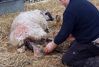 Cuando aparece el cuerpo del cordero, lo aguantamos con el brazo libre y, cuando esté medio fuera, lo retorcemos ligeramente para aliviar la presión. Nos aseguramos de que las fosas nasales del cordero recién nacido están exentas de moco y lo dejamos con la madre para que lo lama.
