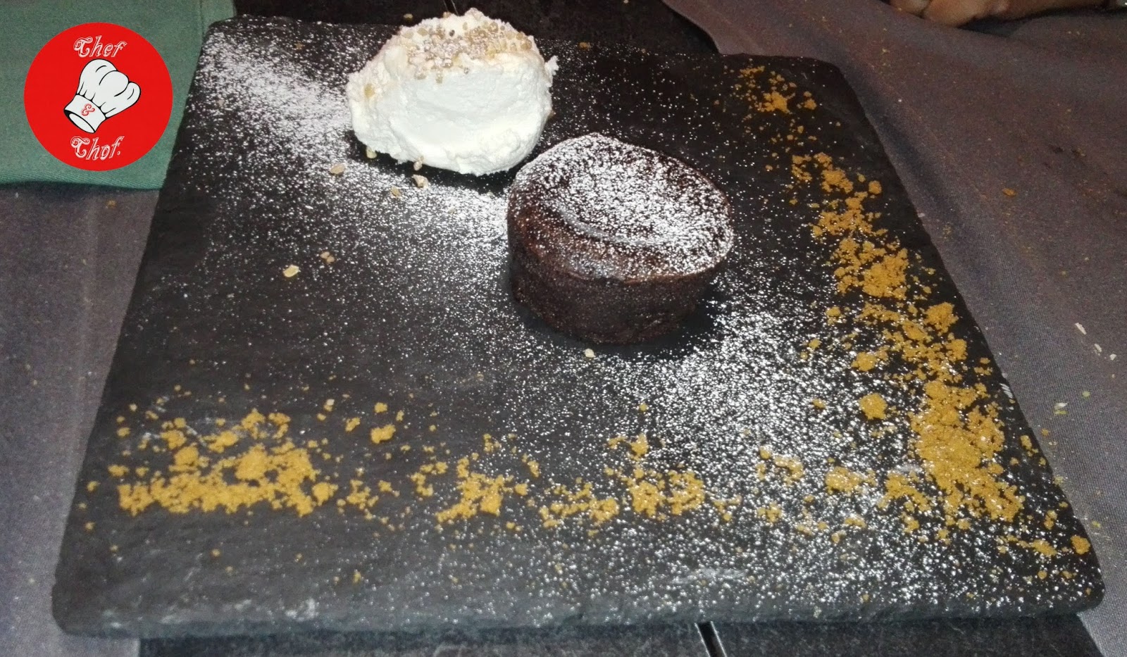 En ese preciso momento el camarero, que en todo momento nos atendió con la mayor eficacia y profesionalidad, o la maquinita que armaba en sus manos, se liaron y trajeron el plato fuerte, una suprema de lubina salvaje, cuando aún quedaban tapas por servir. El proceso de cocción lo hacen de tal manera que los lomos, bien limpios, quedan tiernos, la piel sabrosa y la espina queda tan crujiente que la podemos comer como si fueran chips. Vamos, que no dejamos ni las raspas. Después continuamos con más tapas. La más sofisticada fue la de jamón, caviar y vodka. Una lámina de jamón envuelve a modo de canelón el caviar. Una explosión de sabores que rematamos con un chupito de vodka “en conserva”. Demasiado complejo para mí. Terminamos con unos montaditos de solomillo con foie y cebolla caramelizada. Tapas originales y de muy alto nivel creadas en la cocina dirigida por Manolo Castro.De postre, probamos la tarta de queso que sirven invertida en una tarrina, poniendo la mermelada al fondo y un coulant de chocolate como mandan los cánones, que al partirlo derrame un río de chocolate. Ambos venían acompañados de un denso “pegote” de nata con unos trocitos de almendra. Siempre critico los vicios de algunos cocineros que decoran sus postres con chorro nata industrial y siropes varios adulterando el sabor del postre. En este caso en particular, agradecimos que la pusieran. No solo por el sabor, la densidad y la calidad de la nata, que casi mejoraba a los propios postres, sino que ni se acercaba al coulant, con lo que teníamos la opción de mezclar, o no.