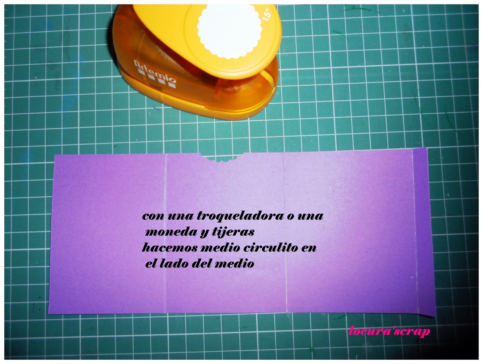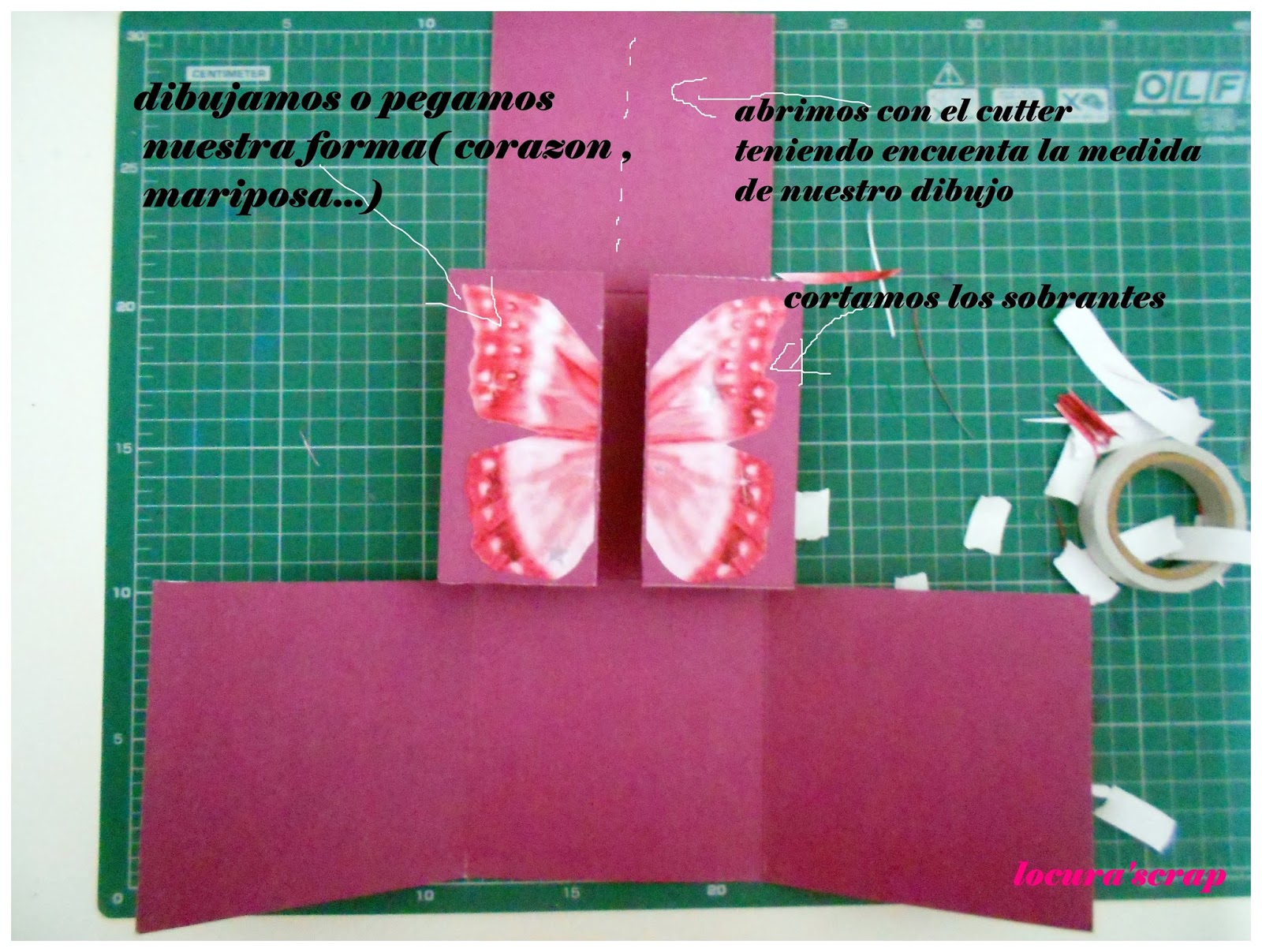 Con un punzón haces un mini agujero en la flecha y otro en el centro del corazón, ademas de en el centro del circulo, luego pasas el brad , abres los brazos y ya esta listo para pegarlo. Recordad pegarlo en relieve para que pueda girar mejor.También añadí una tarjeta deslizante, que al tirar sale a la vez la foto de arriba que de abajo, este es el paso a seguir.