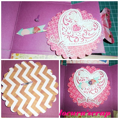 Yo puse un circulo festoneado, encima del circulo en relieve pegue el corazón de picadillo y aparte cogí una flecha y un brad ( encuadernador ).