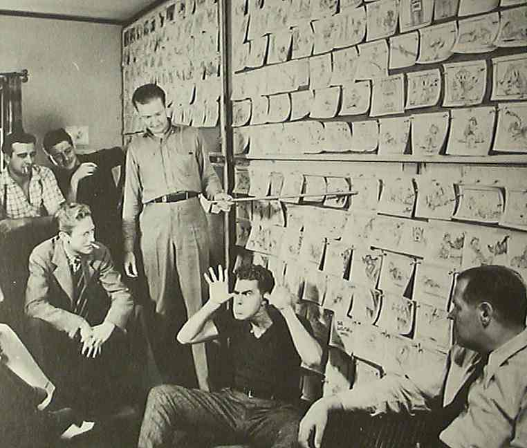 Barks (de pie) presentando el storyboard del corto animado Good Scouts (1938)