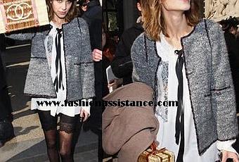 Alexa Chung, la chica "it" del momento, aclamada por todos los medios especializados en moda como icono mundial de estilo, apareció de esta guisa en el desfile de Chanel ayer, en París. El look de Alexa no se cómo describirlo porque me ha dejado atónita. ¿Le falta la falda? ¿Se le han enganchado las medias?