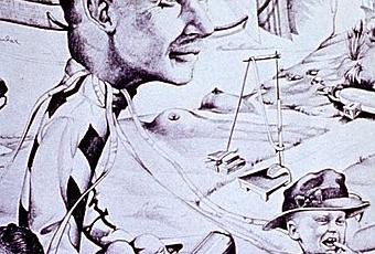 Esta representación la encontré hace mucho tiempo en la National Medical Library de Estados Unidos, y representa, de forma surrealista (o no), el papel del Pediatra en la salud y desarrollo del niño.A la izquierda una madre preocupada llama por teléfono a la enfermera; bajo el niño una multitud de formularios, donde se adivina "tétanos", "pertussis"... Al fondo se ve un campo con plantas jóvenes y finalmente un árbol decrépito. El pediatra es un juguete más de los niños, que tiran de lazos atados a su cuerpo. Entre el Pediatra y la enfermera, una senda en la que se descubre algún juguete, un biberón y dos pechos, además de un tallímetro con unos libros colgando. En la parte inferior izquierda, uno de los niños abre el maletín del médico, donde hay un estetoscopio y un bastón de caramelo.