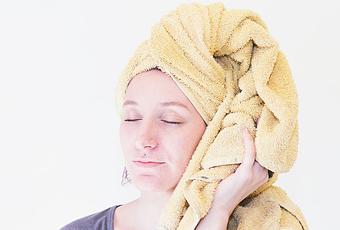 Empiezo con el pelo recién salida de la ducha. No uso ningún producto especial para lavarlo, no soy exigente con los detergentes capilares. En este momento tengo un shampoo para pelo teñido y acondicionador de almendras de la marca Nex que compro por Bidones una vez al año y luego me olvido. Algo que siempre siempre repito es esto de dejarme el toallon en la cabeza unos cuantos minutos (de acá a The Towel Series). Normalmente este es el lapso que uso para ponerme cremas, o maquillarme, o todos esos cosos de minita.