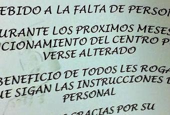 El Centro al que nos referimos, uno de tantos, tiene sus puertas y pasillos cubiertos de mensajes en línea con el que pueden ver en la fotografía: disculpas que pretenden justificar los retrasos y deficiencias en la atención que, al contrario de lo que destacan, NO se deberían a la FALTA de PERSONAL, sino a la ausencia de contratación del mismo.