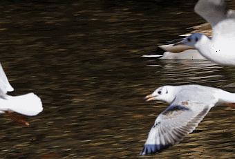 Grupo de reidoras persiguiendo a otra gaviota que acaba de capturar un pescadito