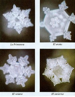 3.- Cuando el agua fue tratada con aceites florales aromáticos, los cristales tendieron a imitar la forma de la flor original. Aquí cristales de agua expuestos a esencia aromática de manzanilla."Me das asco"