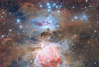 Toda la región de Orion, situada a unos 1.600 años luz de distancia, está inundada de intrincados y vistosos filamentos de polvo. Opaca a la luz visible, el polvo se crea en la atmósfera exterior de estrellas frías y masivas y es expulsada por un intenso viento de partículas. El Trapezio y otros cúmulos donde se forman estrellas están incrustados en la nebulosa. En la fotografía, los intrincados filamentos de polvo que rodean M42 y M43 parecen de color marrón, mientras que el resplandeciente gas central destaca en rojo. En los próximos millones de años gran parte del polvo de Orion será lentamente destruido por las mismas estrellas que ahora se están formando, o bien se dispersará por la galaxia.