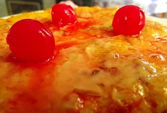 Yo le unte un poco de flan de leche por encima y lo decore con cherries y un poco del jugo de las mismas.