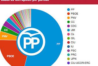 1. El Partido Popular copa el 86% del coste de los 387 “casos aislados” de corrupción en España, 122.038 millones de euros. La “medalla de plata” queda muy lejos, para los 10.556 millones que atesora el PSOE, que tampoco están nada mal. Convergencia Democrática de Cataluña (CDC), al servicio del sistemático plan de depredación del clan Pujol en Cataluña consigue un honroso tercer puesto, con 5.078 millones de euros, un nada casual 3% del monto del latrocinio del país.2. En la estadística de casos de corrupción por partido, el PP sigue ganando por goleada pero con menos margen, lo que demuestra que no sólo mangan más que el resto de los partidos sino mucho más a lo grande. El 53,9% de los casos corresponden al partido que preside M. Rajoy, seguido, una vez más, del PSOE, con un 21,5%. El PNV consigue meter el hocico en este ranking, con 16 casos, desbancando a sus rivales y sin embargo amigos catalanes del CDC, relegados a una cuarta posición. Hay tiempo para la remontada.3. En el ámbito territorial, las corruptelas nacionales se llevan la palma: 109.422 millones, el 53,2% del total. La Comunidad de Madrid hace gala de la capitalidad del Reino y encabeza la clasificación regional, con un estruendoso 23% de los casos de corrupción. El PP de Madrid viene a ser el CEU de la corrupción nacional y los de provincias unos aficionados: valencianos, gallegos y andaluces (sí, estos son sociatas) siguen de lejos a los madrileños en esto del pillaje institucional.