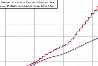 Acabo de ver la gráfica de más abajo y me parece interesante traerla aquí. Se entiende bien: la línea más baja muestra cómo ha ido variando el precio de un coche nuevo en Estados Unidos (un 95% desde 1977), la que se encuentra en medio refleja la subida del precio de la asistencia médica (613%) y la más alta es la que muestra la subida de las matrículas universitarias (1140%). No creo que sean necesarios más comentarios.