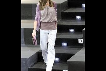Y un debut así no podía hacerlo de cualquier manera. Por eso ha recurrido a uno de sus diseñadores de cabecera, Adolfo Domínguez. Pantalón blanco -ella y sus kilos de menos se lo pueden permitir-, blusa de gasa malva y rebequita en el mismo tono. Muy mona. Aunque o llevaba el pantalón mal puesto o el bajo estaba mal cogido... porque esta diferencia en el largo de las perneras no parece ser una nueva tendencia de moda.