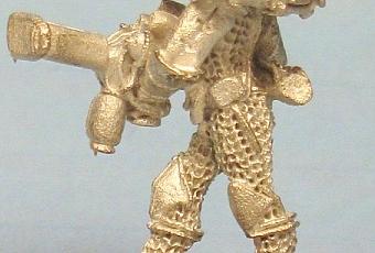 Como notas curiosas de la mini,os podría decir que lleva una versión futurista de las armaduras de cota de malla de cuerpo entero que usaban en aquellos años los Elfos Oscuros de WFB(3ª edición),casco que recuerda a lo yelmos ligeramente cónicos que usan los elfos,pero con una masca facial con visores y todo ello unido a lo que parece un voluminoso generador dorsal.No parece que lleve mas arma que la que empuña,que al principio me pareció un lanzallamas,pero que al verla mas detenidamente me dado cuenta,por el cañón y el deposito en vertical que lo que empuña es un rifle "enredadera" o "encolador"(Web Gun o simplemente Webber),un arma que dispara una masa de filamentos pegajosos que atrapan al objetivo y que se hacen mas sólidos cuando mas forcejea la victima hasta dejarla aprisionada o incluso si es frágil aplastarla.La masa de filamentos pegajosos,una vez endurecidos se suele disolver al cabo de un tiempo o con un producto adecuado.Parece que tenían claro que como los Elfos Oscuros de WFB, sus parientes espaciales iban a tener una fijación,necesidad o interés en capturar a otros(Esclavos?) y por eso el arma que empuña no es una netamente ofensiva y destructora como el resto de las que empuñan los ilustres miembros de "Los míticos 14" del RT.