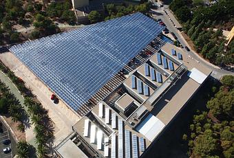 Imagen aérea de la pérgola fotovoltaica junto a la Facultad de Trabajo Social (A3)