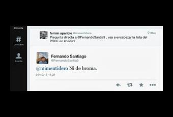 Sí hace unos días, se "filtraba" una supuesta encuesta que presuntamente había encargada el PSOE local de Cádiz, en la que no salían airosos ni mucho menos, hoy a través de la cadena Ser, se "filtra" un presunto sondeo interno en el que dicen que "la militancia" se inclinaba como candidato de la formación a la alcaldía de Cádiz por Fernando Santiago. Como conozco a Santiago y se que es un usuario de las redes sociales se lo pregunte directamente, dejo pantallazo de la pregunta y contestación.
