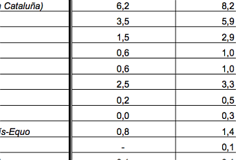 En comparación con el barómetro de abril de 2014 el PP bajaría del 31,9% al 30% y el PSOE del 26,2% al 21,2%. También bajarían IU (del 10,9% al 8,2%) y UPyD (del 8,9% al 5,9%). Entre los partidos de ámbito no estatal bajarían todos los partidos excepto ERC: ERC (+0,8), CiU (-0,1), Compromís (-0,3), Amaiur (-0,3), PNV (-0,1), BNG (-0,1) y Coalición Canaria (-0,1).