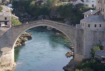 Bosniaes tierra de puentes. Zona de paso entre Oriente y Occidente, su geografía se ha visto jalonada por numerosas obras de ingeniería que trataban de salvar una orografía imposible y escabrosa. Durante la dominación turca, en el siglo XVI, los sultanes conocían la importancia de salvar los cursos de agua para favorecer el comercio, las comunicaciones y continuar su imparable marcha hacia la Europa católica. En el año 1557, el sultán Solimán el Magnífico ordenaba a uno de sus mejores arquitectos, Mimar Hajredin, formado con el configurador de los principios básicos de la arquitectura otomana, Sinan, la construcción de un puente para salvar el curso del río Neretva.Después de nueve años, las obras finalizaron y dibujaron para siempre el perfil de la que habría de ser la ciudad de Mostar. Sobre el río Neretva, a veinte metros de altura, se levantaba un poderoso puente de un solo arco y perfil de “lomo de asno”, de treinta metros de largo y cuatro de ancho, flanqueado por dos grandes torres en cada una de las márgenes del río. Un puente blanco, gracias a las calidades de sus casi quinientos bloques de piedra extraídos de las canteras locales y que han configurado los tonos básicos de la ciudad de Mostar, con ese color que resplandece bajo el cielo azul y sobre las aguas verde esmeralda del Neretva. Un auténtico prodigio de la ingeniería de todos los tiempos que ha sido capaz de soportar siglos de historia. Incluso, se dice que soportó el paso de los tanques nazis durante la Segunda Guerra Mundial.Puente provisional sobre el Neretva en 1998