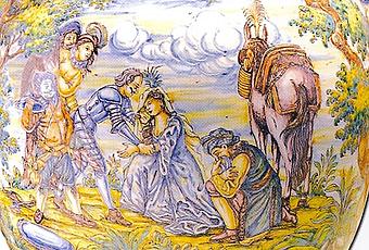También entonces son muchos los alfares que tienen en los motivos de el Ingenioso Hidalgo un recurso pictórico con buena demanda comercial, por lo que se han mantenido hasta ahora, momento en que todos los actuales obradores, algunos con raíces familiares y muchos otros nutridos con las jóvenes manos salidas de la Escuela de Artes y Oficios, continúan inspirándose en los viejos motivos cervantinos, aunque innovando en muchos casos en formas y en colores, pero sin perder nunca el espíritu tradicional que desde hace siglos guía a nuestra artesanía.Escena del Quijote de Artesanía Talaverana. Foto de Vicente CansecoLas piezas sobre las que aparece el loco genial y su escudero son de lo más variopintas. En primer lugar, debemos hacer referencia a los paneles de azulejería que en número de doce hasta casi cien están destinados a decorar superficies de dimensiones muy variables. Muchos de ellos presentan grecas renacimiento enmarcando la escena quijotesca y otros simplemente dibujan el motivo sin orla o cenefa alguna que lo enmarque.