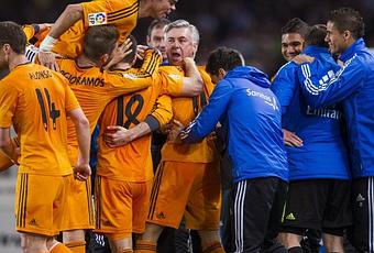 Real Sociedad 0 - 4 Real MadridExhibición de pegada de los de Ancelotti tras un primer tiempo igualado. Marcaron Illarramendi, Bale, Pepe y Morata. El Real sigue enganchado a la Liga.Hasta el gol de Illarra, el partido había discurrido en un equilibrio caótico, sin pausa y sin dominio de nadie, repleto de ataques desordenados. Del desgobierno participaban los asistentes del árbitro, señores Fernández Miranda y Aboy Rivas, incapaces de atinar en los fueras de juego. Por suerte para ellos, ninguno de sus errores terminó en gol. Se lo tendrán que agradecer sobre todo a Diego López, que rechazó un tiro a bocajarro de Vela en una acción mal anulada.