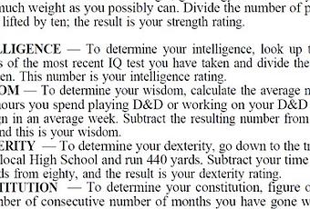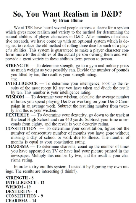 Al parecer, en aquellos entonces, la gente ya se quejaba de que el sistema de puntuación de atributos de PJs y PNJs de D&D no era todo lo realista que a ellos le gustaba,por lo que Brian Blume les dio este peculiar sistema para calcular,de forma "realista" cuales serian sus puntuaciones en atributos físicos (FUE, DES y CON) y mentales (INT, SAB y CAR) si ellos mismos fueran a ser PJs de una partida de D&D.