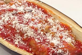 8. Rellenar las mitades de las berenjenas con la mezcla. Cubrir con salsa de tomate (y queso rallado, si queremos).