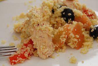 Ingredientes 1 cuenquito de cous cous caldo vegetal tomate pimiento rojo asado aceitunas negras lomos de bonito del Norte cebolla sal aceite de oliva