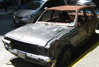 Una chatarra permanente en la Plaza Las Delicias de Sabana Grande, se trata de un automívil que tiene mas de dos años en la zona, ha sido desvalijado, incendiado y ahora utilizado como depósito de basura. Ante los ojos de las diferentes autoridades que transitan por el sector, el auto ha sido chequeado por las autoridades varias veces y no aparece como hurtado o solicitado por ningún organismo. El propietario lo ha abandonado a su suerte. Falta que la instituciones oficiales o al organismo que le compete proceda a retirarlo de circulación, y que sea llevado para fundirlo y hacer cabillas para la Misión Vivienda