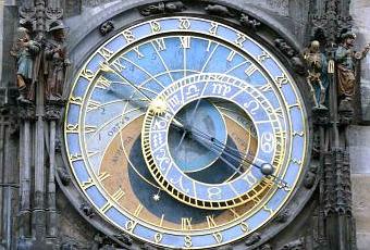 La zona superior muestra autómatas añadidos en el siglo XIX, la esfera inferior (1490) es un calendario con su abigarrado santoral y la espectacular esfera central (1410) es el reloj astronómico que da la hora solar oficial, las antiguas horas bohémicas, las fases y movimiento de la Luna, y tanto la posición del Sol en el zodiaco como la situación diurna /nocturna o crepuscular.