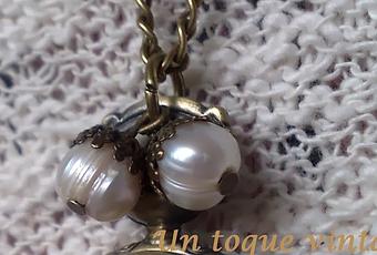 Con este breve resumen quiero presentaros una nueva pieza de mi tienda, es un reloj con cadena que me ha enamorado por su pequeño tamaño y el grabado de su parte trasera también por el cristal color miel de la delantera.Como me encantan las perlas le he añadido dos pequeñas perlitas naturales de rio.