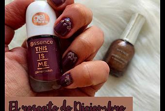 Entre un esmalte burdeos de Essence y uno con glitter de Wynie. Así que he hecho una manicura con ambos.