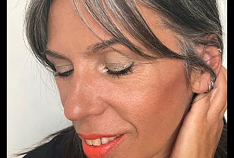 Para contrastar, el maquillaje de ojos lo hice en tonos gris verdoso suave. Ya que los labios serán llamativos, me ha gustado la idea de hacer unos ojos más ligeros. Así que usé dos sombras, una más clara en todo el párpado móvil y una más oscura en la zona externa. También marqué un poco la zona externa del ojo tanto a ras de pestañas superiores como inferiores con un lápiz gris muy oscuro, que siempre queda más suave que un khol negro. En la zona del lagrimal y el inicio de la línea de agua apliqué lápiz blanco, e iluminador.Te dejo el zoom de ojos para que lo veas mejor.